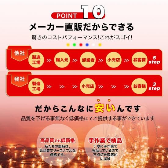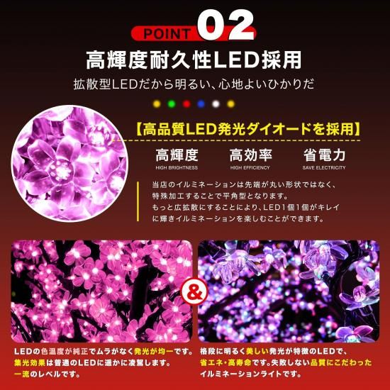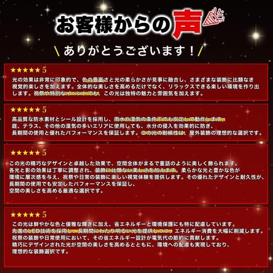 ・玄関アーチ: 桜光で入口を華やかに。来客を明るくお出迎え。 ・庭木&生垣: 幹や枝に沿わせて“雪化粧”のようなきらめき。 ・バルコニー手すり: 通りから見える演出で雰囲気UP。 ・クリスマスツリー: 既存ライトにプラスして量感アップ。 ・ショップ装飾: 冬限定ディスプレイで集客アップ。