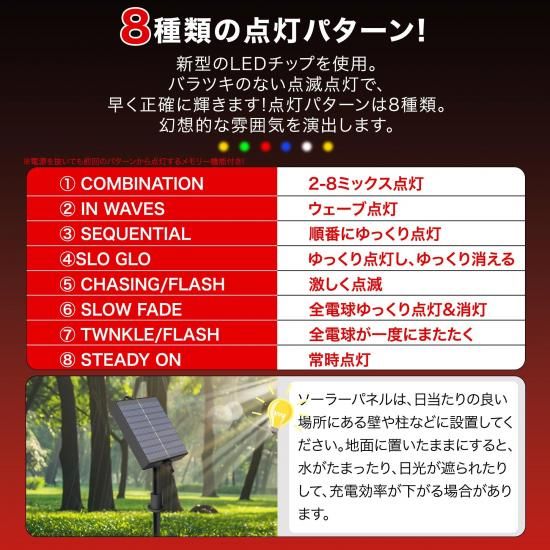 1:Combination(2〜8を順番に繰り返し) 2:In Wave(波のような点滅) 3:Sequential(順番に点灯) 4:Slow Glow(ゆっくり点灯) 5:Chasing/Flash(追いかけ/フラッシュ) 6:Slow Fade(全体がゆっくり消灯) 7:Twinkle/Flash(きらめき点滅) 8:Steady On(常時点灯)